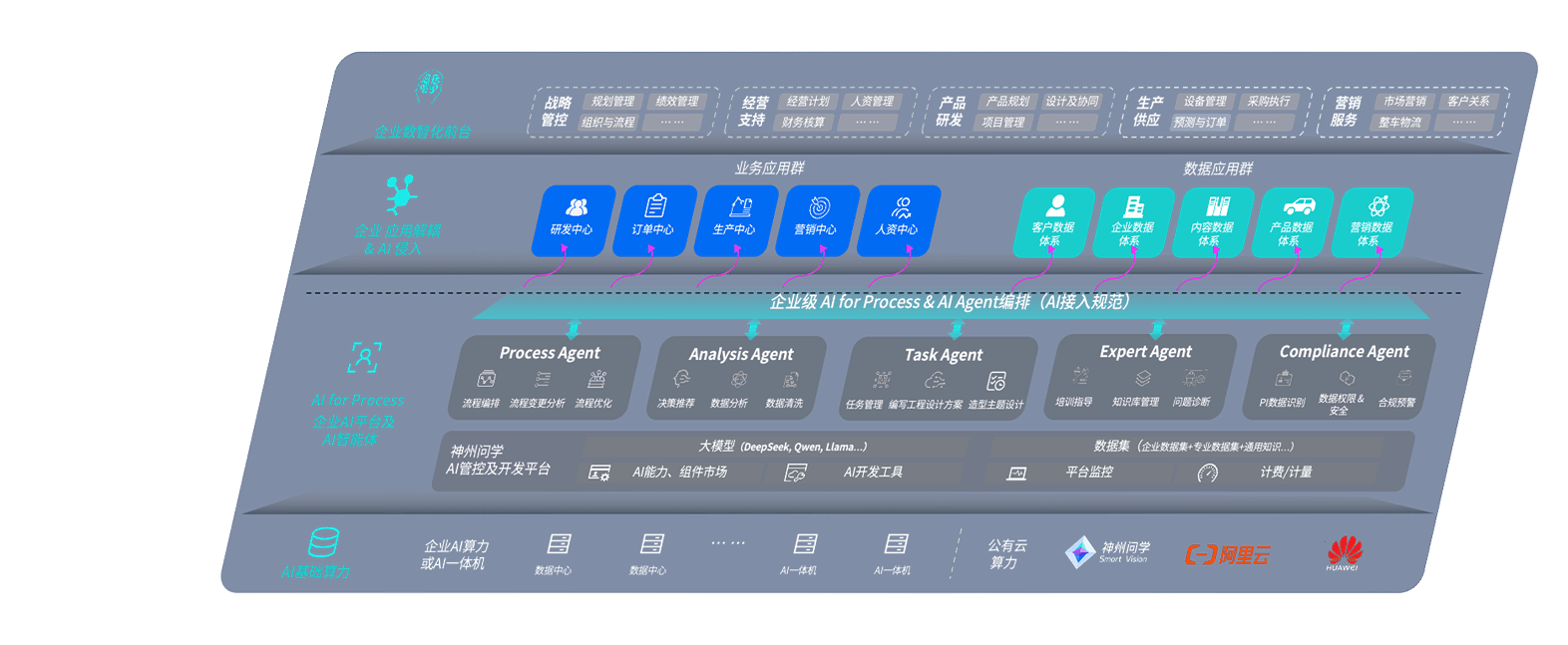 端到端的一站式AI工作空间深度融合了从企业战略规划到日常经营的全流程业务板块,,,定向解决车企内部领域多、、部门多、、、、链条长、、、、场景碎片化等难题,,,支持车企快速构建以AI为核心的生产力写作体系,,实现任务执行与AI能力的无缝集成与交互